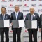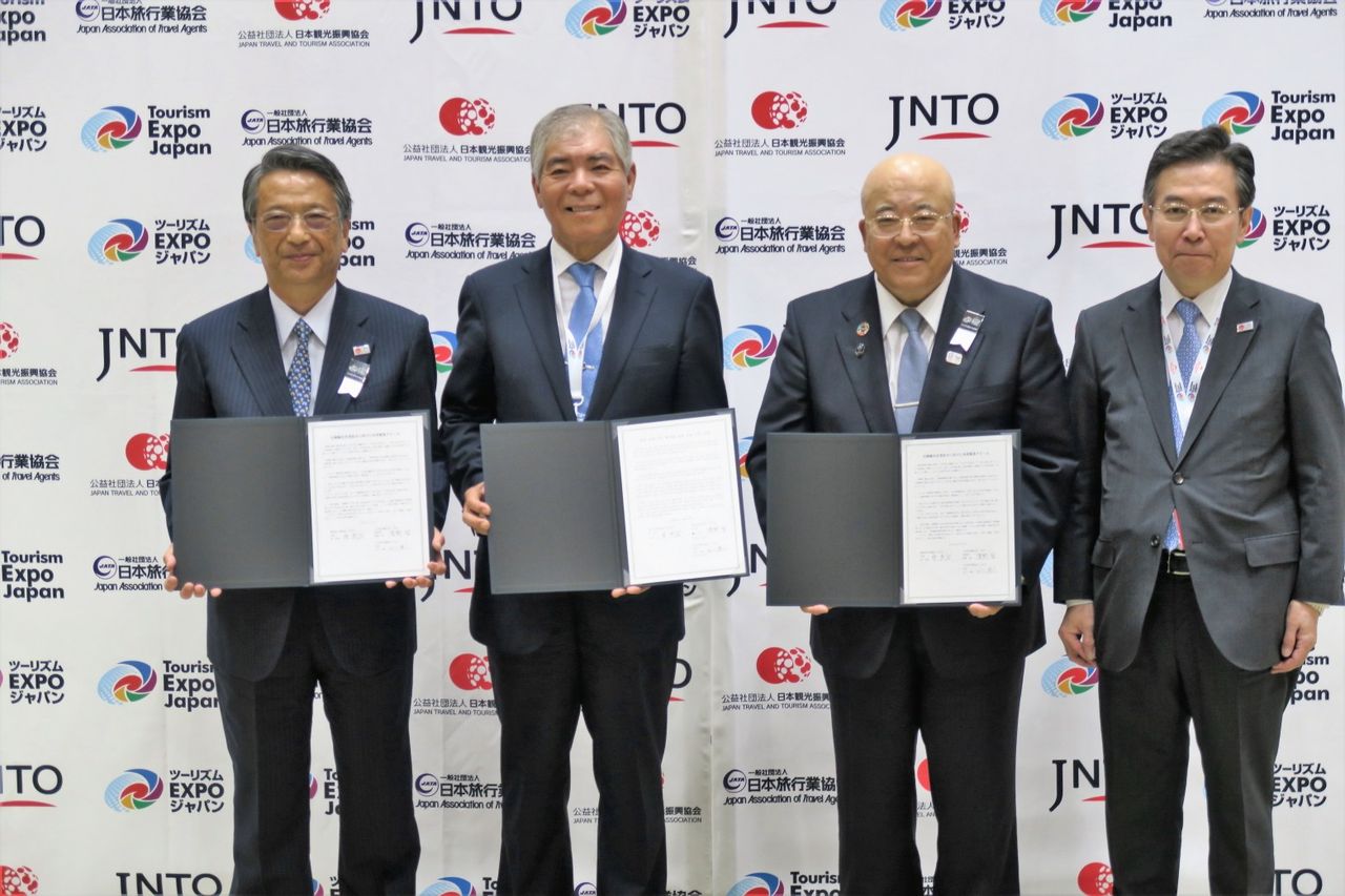 JNTOの清野智理事長、JATAの田川博己会長、KATAの梁武承会長が東京ビッグサイトのツーリズムEXPOジャパン2018会場内で署名。観光庁の田端浩長官が立ち会った。